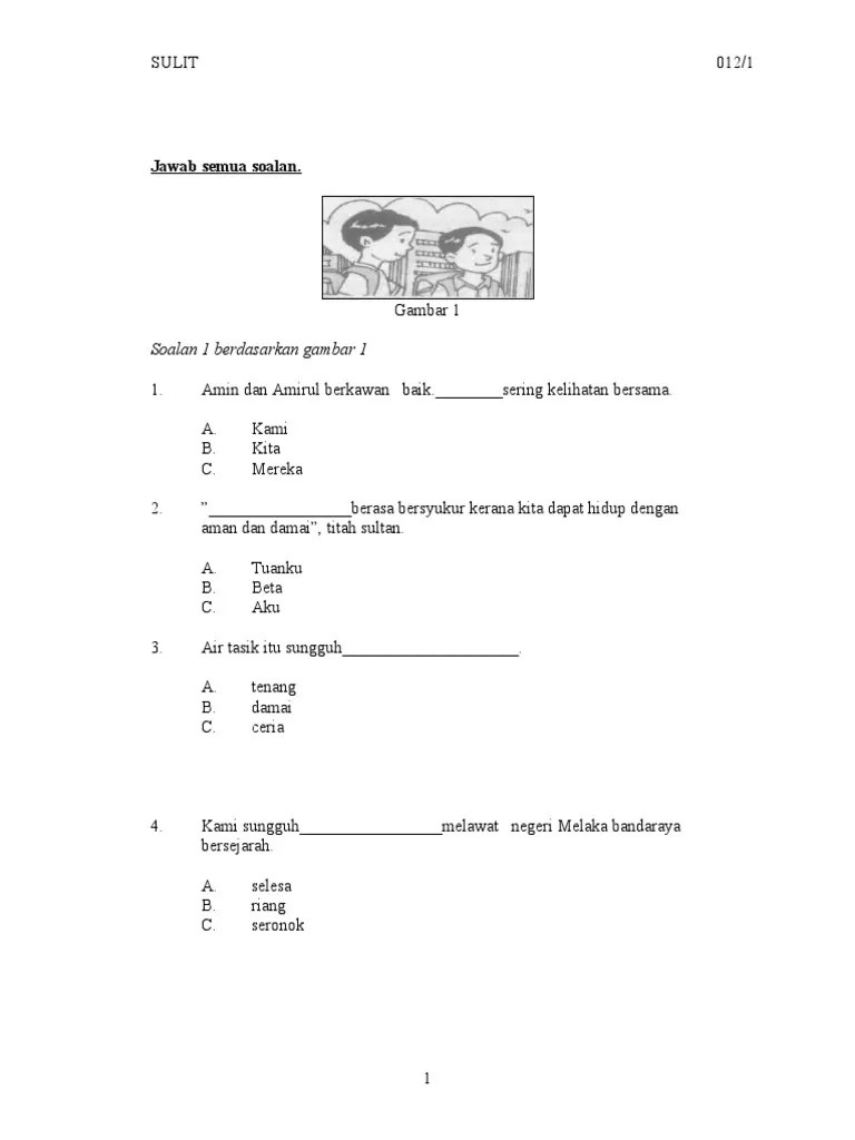 Soalan peperiksaan akhir tahun 2018 darjah 1 . Soalan peperiksaan akhir tahun 2018 kssr (semakan 2017) tahun 1 bahasa melayu. Kertas soalan peperiksaan percubaan bahasa melayu (bm) upsr 2018 + skema jawapan. Related posts to contoh soalan tahun 1 bahasa melayu 2018 contoh soalan. Contoh ujian diagnostik bahasa melayu pemahaman tahun 6 upsr.